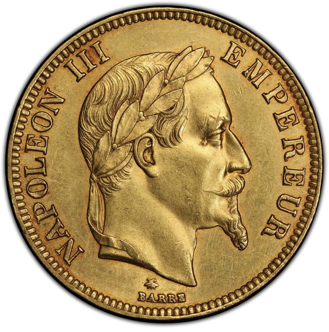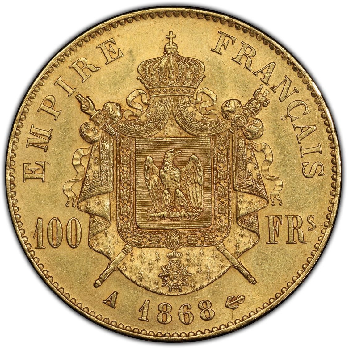 Le tout sommée d'une couronne impériale de laquelle partent deux rubans ; au-dessous, le millésime 1868, la lettre d'atelier A à gauche.