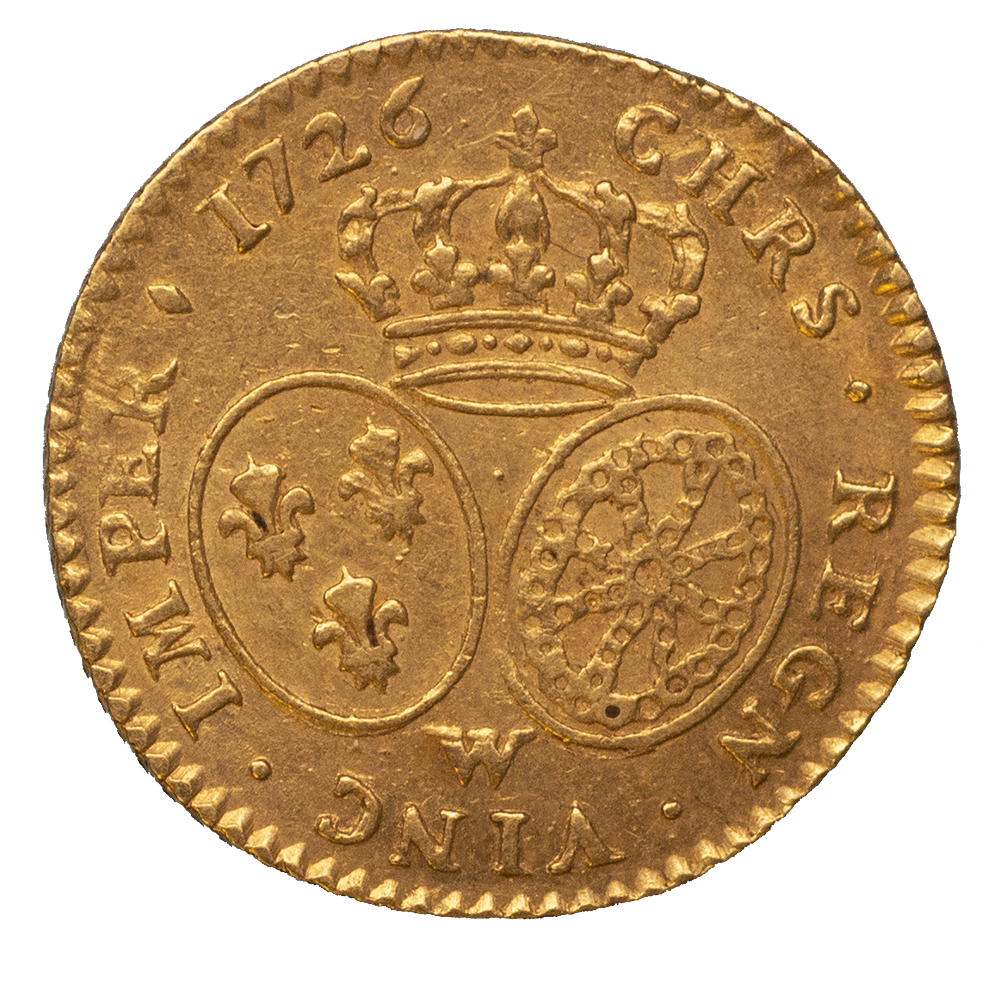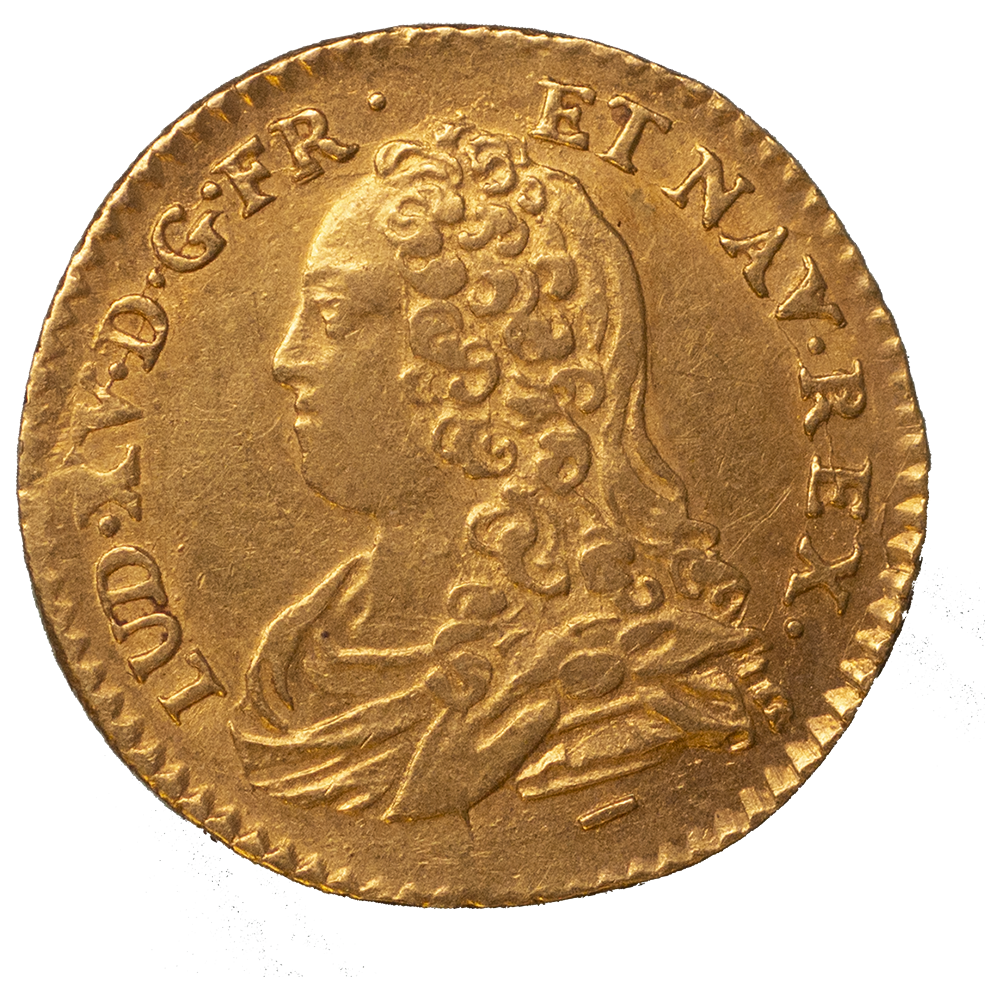 Légende : LUD. XV. D. G. FR. ET NAV. REX. (Louis XV, par la grâce de Dieu, roi de France et de Navarre)