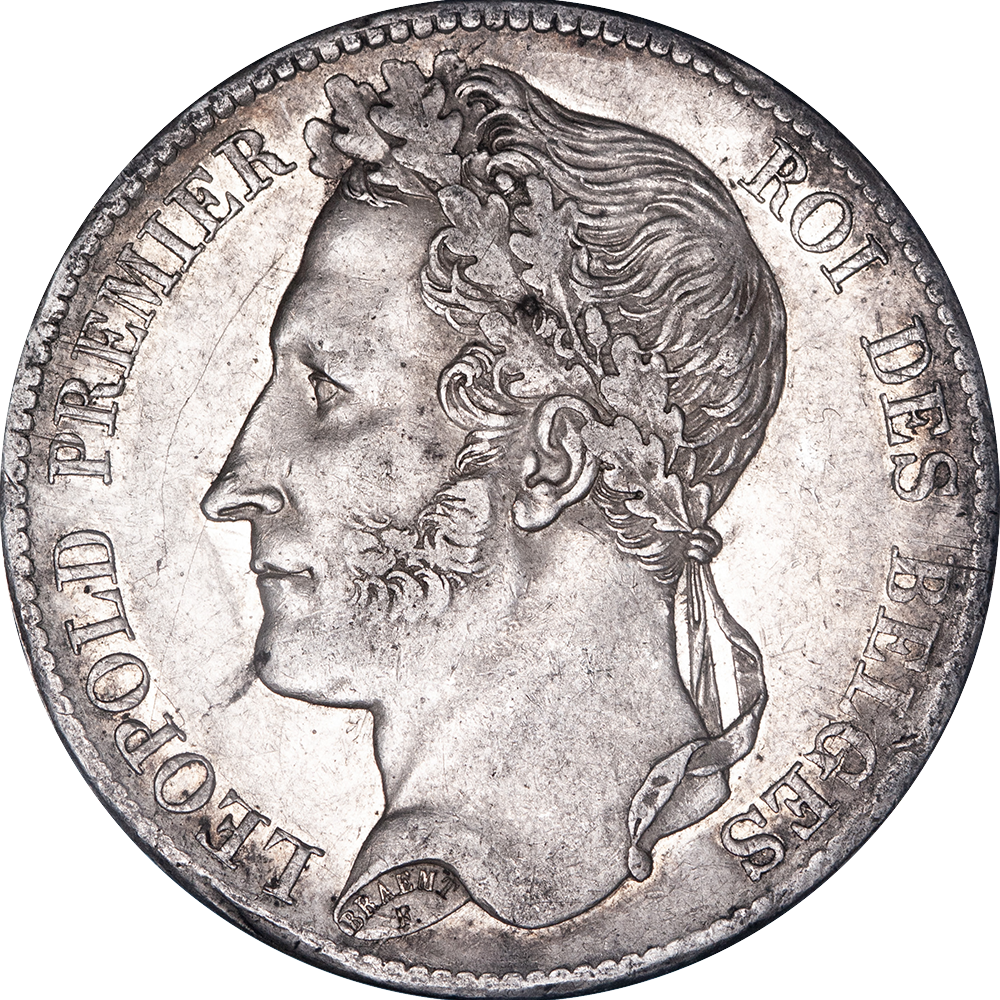 Description : Tête de Léopold Ier à gauche, coiffée de la couronne de chêne ; signé BRAEMT F. sur la tranche du cou.