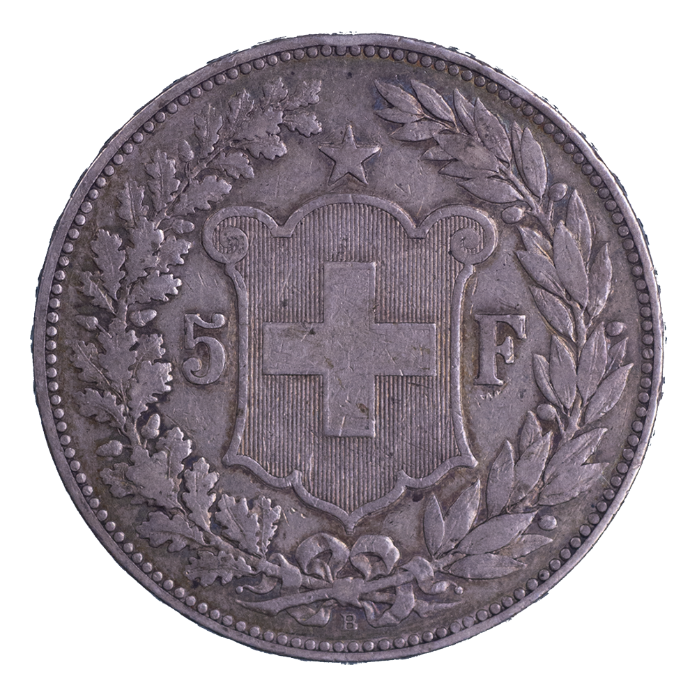 Description : Ecu orné de La Croix suisse, encadré par une paire nouée de branches de feuillages composites. Surplombé d'une étoile à 5 branches, valeur faciale de part et d'autre
