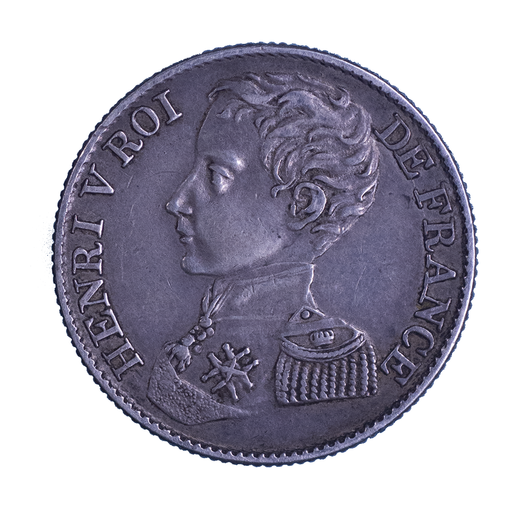 Henri d’Artois est né le 29 septembre 1820. Il reçoit par souscription nationale, le château de Chambord, ce qui lui vaudra le titre de Comte de Chambord. Il est le dernier descendant légitime de Louis XV. Les monnaies à son effigie seront frappées de 1831 à 1873.