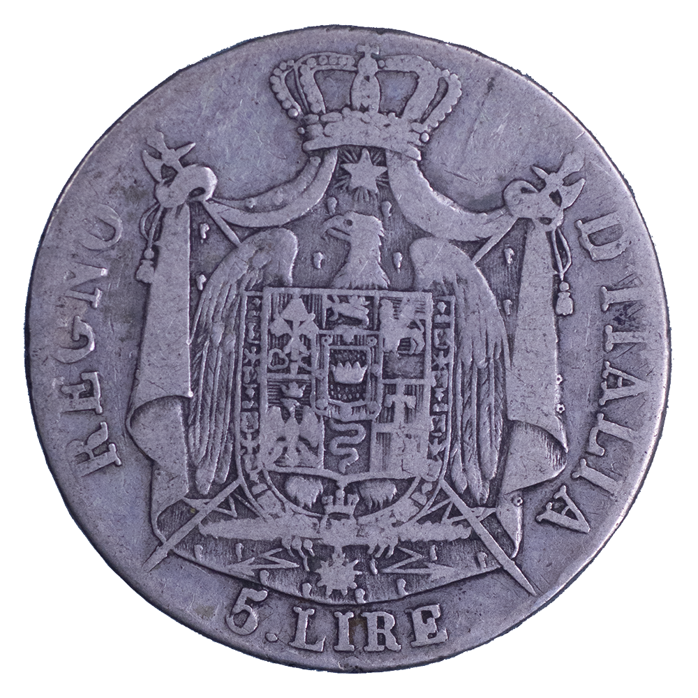 Pièce de 5 lire de Napoléon en argent, la monnaie a été légèrement nettoyée sur la face, de plus on retrouve certaines traces d'usures dues à sa grande circulation.