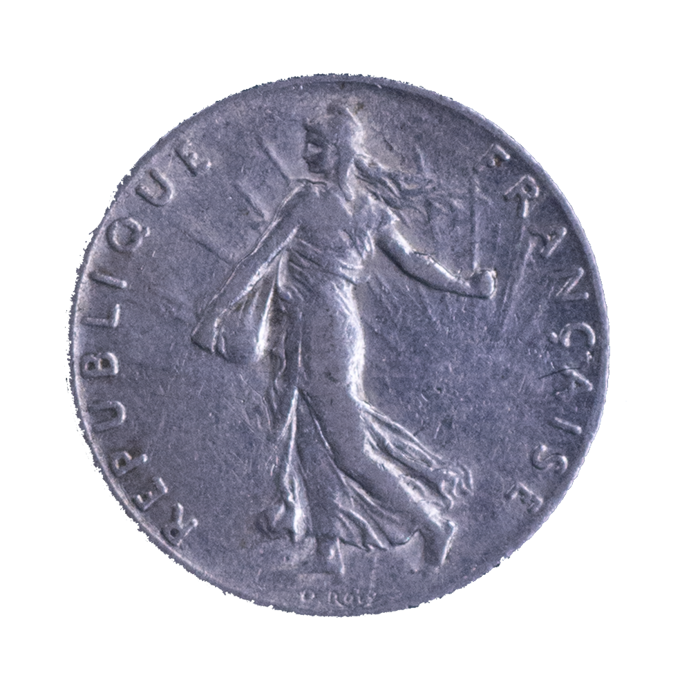 Description : La France sous les traits d'une Semeuse marchant à gauche et semant à contre-vent ; derrière le soleil levant , signé O. Roty en creux au-dessous.