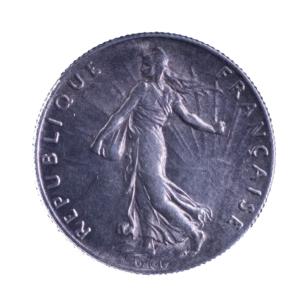 Description : La France sous les traits d'une Semeuse marchant à gauche et semant à contre-vent ; derrière le soleil levant , signé O. Roty en creux au-dessous.