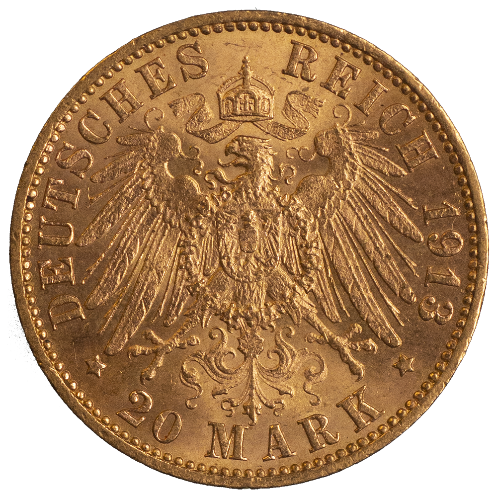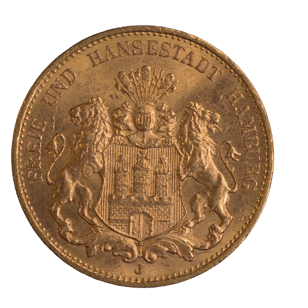 Cette pièce de 20 Mark Or de la ville hanséatique de Hamourg a été frappée à plus de 7,5 millions d'exemplaires entre 1875 et 1913. Cette pièce en Or allemande pèse 7,96 grammes pour un titrage de 900‰, comme toutes les pièces d'or de 20 mark de l'Empire allemand. Elle est témoin de la structure politique assez particulière de l’Empire, avec des “États libres”. En effet Hambourg, cité hanséatique, réussit jusqu’en 1918 à conserver son statut de ville libre et son indépendance. Une pièce historique, idéale pour votre collection.