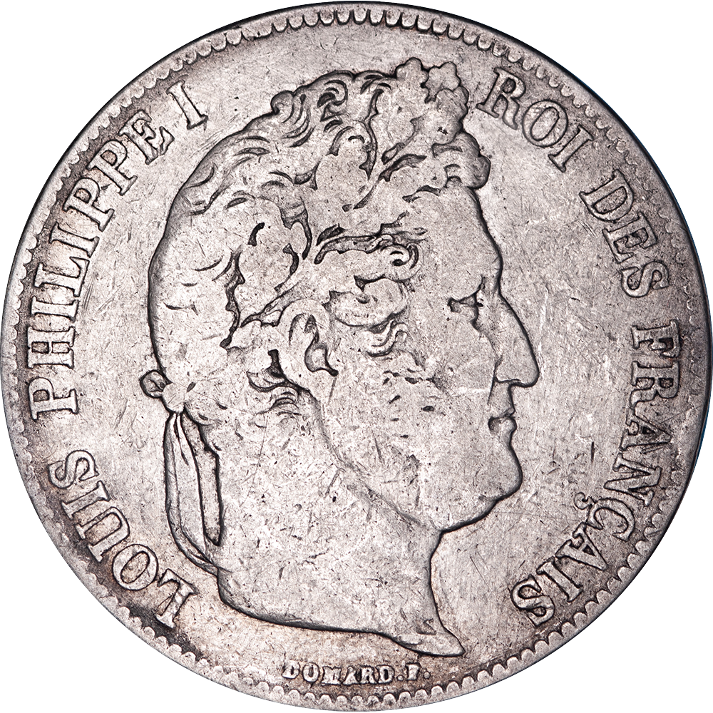 Description : Profil droit de Louis-Philippe 1er coiffé d'une couronne de chêne dont l'une des extrémités du ruban qui la noue derrière la tête revient sur le bas du cou ; signé DOMARD* F* au-dessous du cou contre le listel.