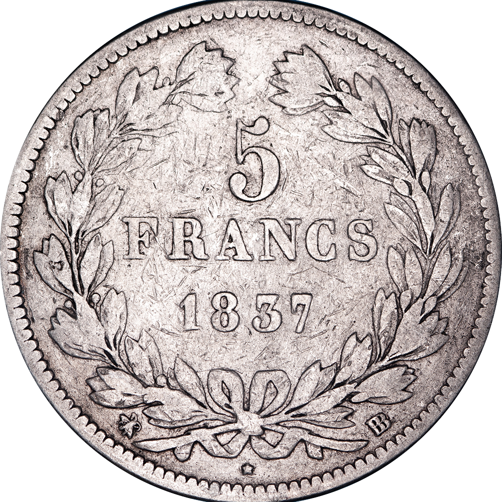 5 FRANCS sur deux lignes, au-dessus du millésime 1837, le tout dans une couronne nouée par un ruban à sa base, formée à gauche d'une branche de laurier, à droite d'une branche d'olivier ; au-dessous du noeud le différent de Graveur Général encadré du différent de Alfred RENOUARD DE BUSSIERE à gauche et de la lettre d'atelier BB à droite.