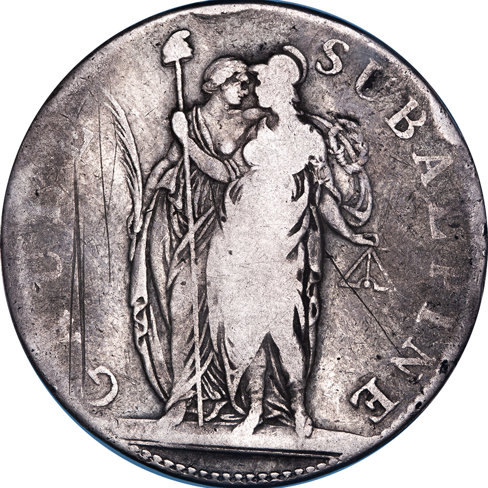 Description : La Gaule Subalpine et la France debout de face, tenant une palme et une couronne, une pique surmontée d'un bonnet phrygien et un niveau ; signé LAVY.