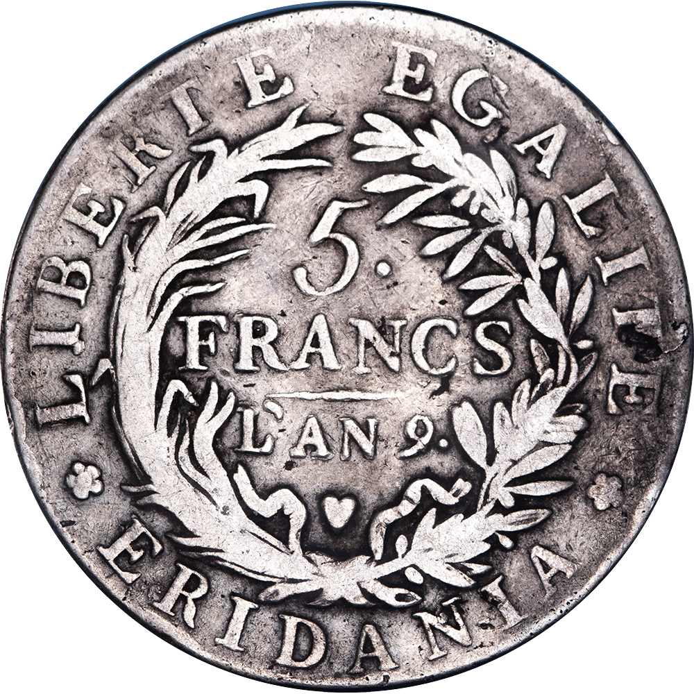Titulature : LIBERTÉ EGALITÉ / *ERIDANIA*/ 5./ FRANCS/ - / L'AN 10