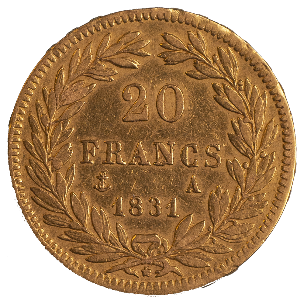 Description : 20 FRANCS sur deux lignes dans une couronne formée d'une branche d'olivier à droite et d'une branche de laurier à gauche, millésime 1831 sous la faciale, différents de Directeur Alexandre BEAUSSIER et lettre d'atelier A le long du listel de part et d'autre du différent de Graveur Général placé sous le noeud qui réunit les deux branches de la couronne.