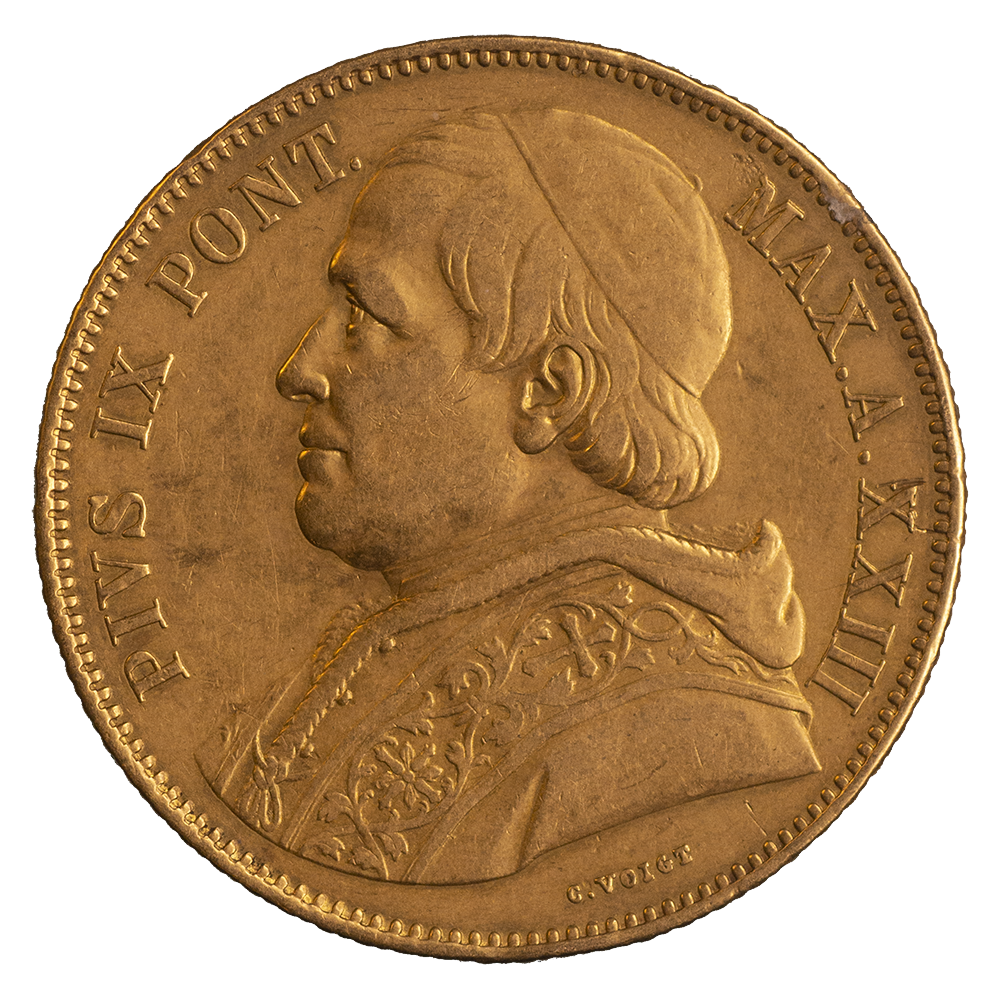 Légende : PIVS IX PONT. - MAX. AN. XXIII. (Pie IX, Grand Pontife, année 23.)