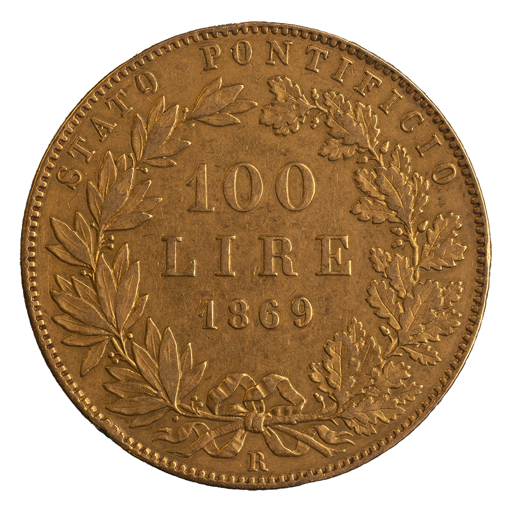 Légende : STATO PONTIFICIO / 100/ LIRE/ 1869 / R.