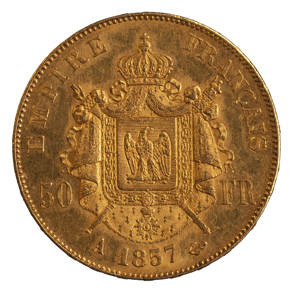 Le tout sommée d'une couronne impériale de laquelle partent deux rubans ; au-dessous, le millésime 1857, la lettre d'atelier A à gauche.