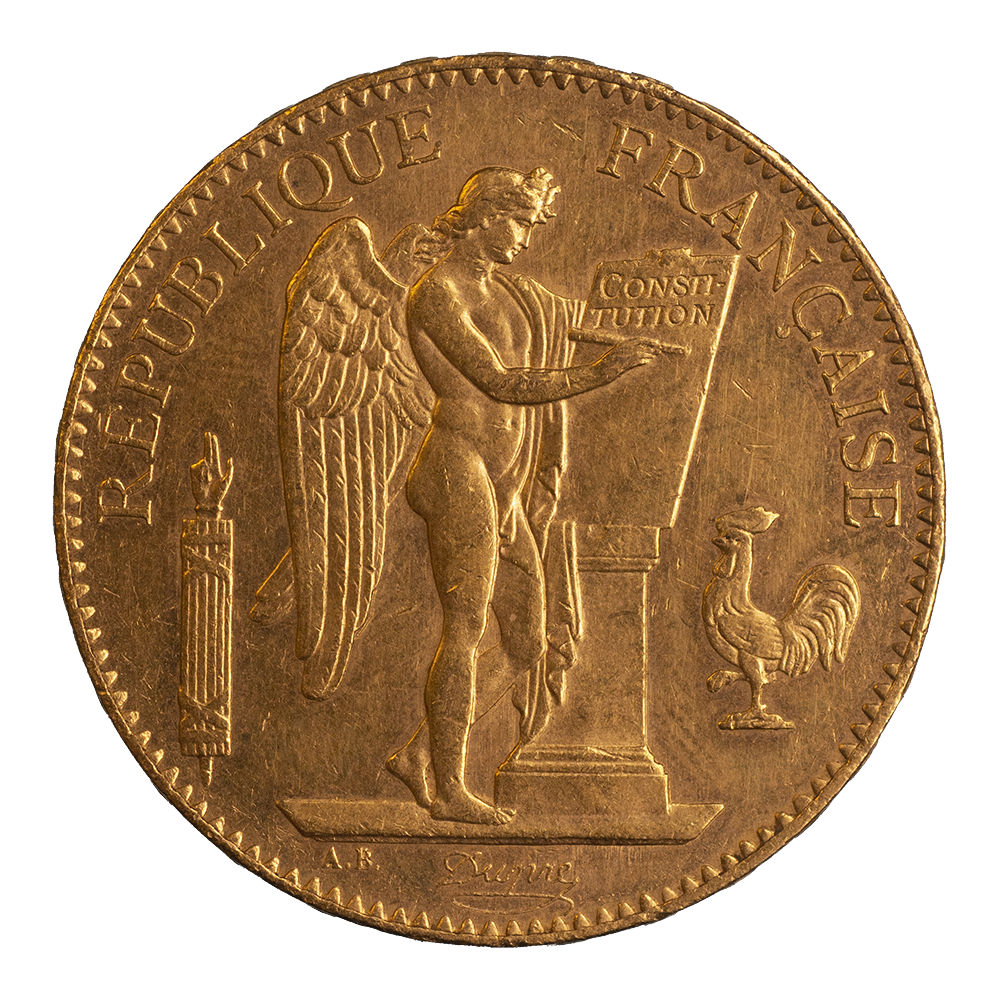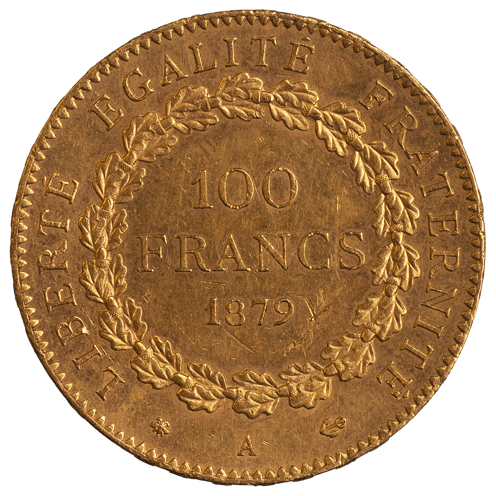 Description : 100 FRANCS sur deux lignes suivi de son millésime 1879 dans une couronne de chêne fermée et continue, lettre d'atelier A sous la couronne entre les différents REGIE DES MONNAIES.