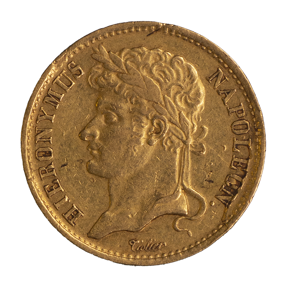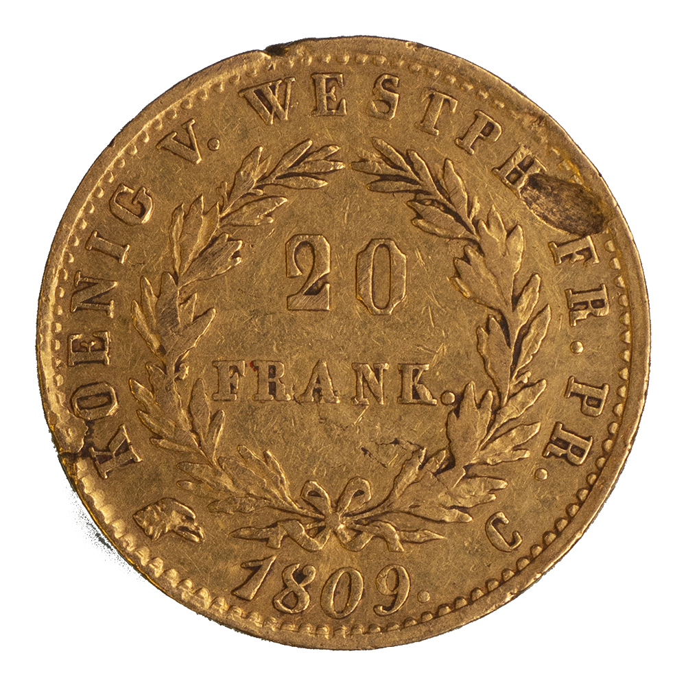 Description : 20/ FRANK. dans une couronne formée de deux branches d'olivier. Légende : KOENIG V. WESTPH. FR. PR. / (MM) 1809. C. (roi de Westphalie prince français).