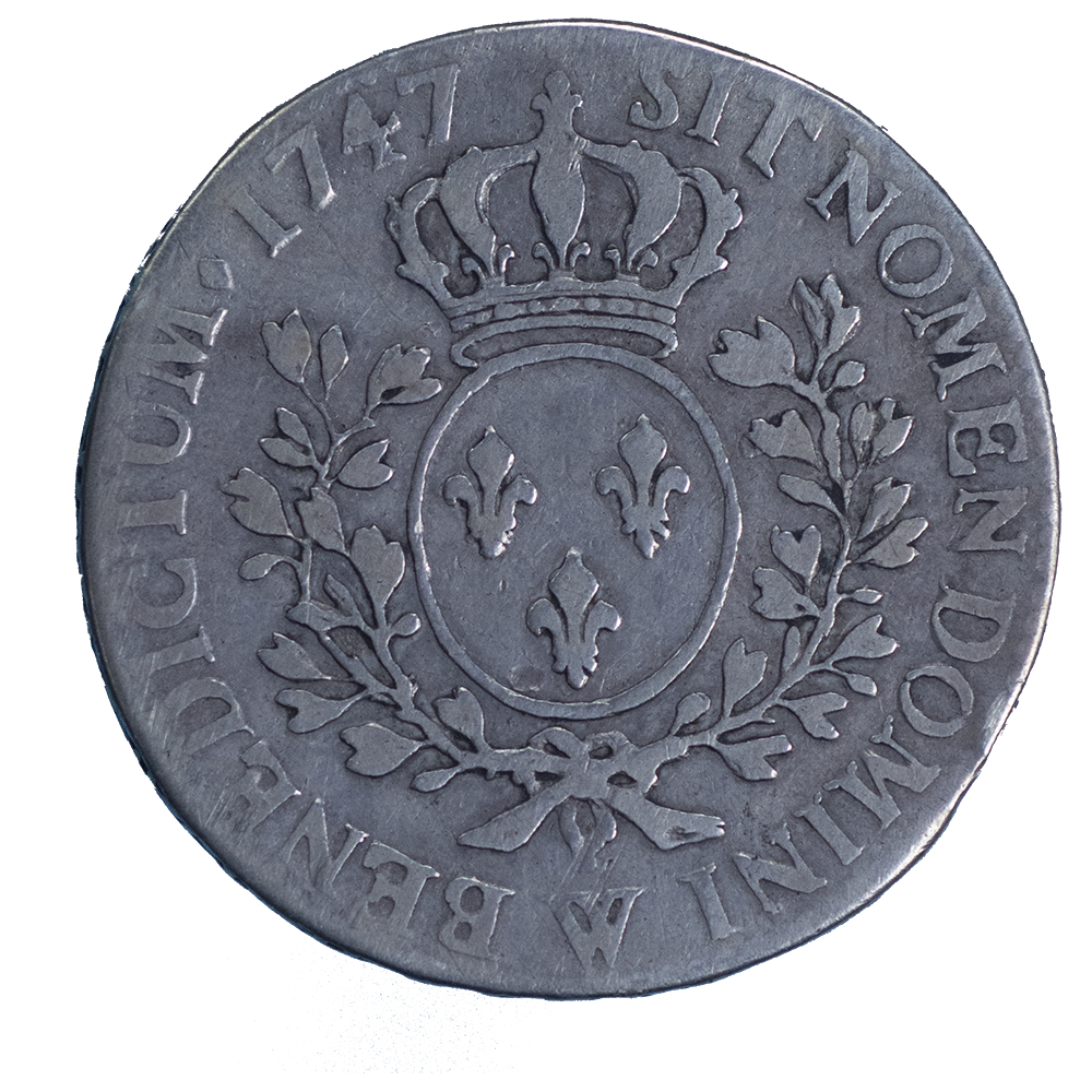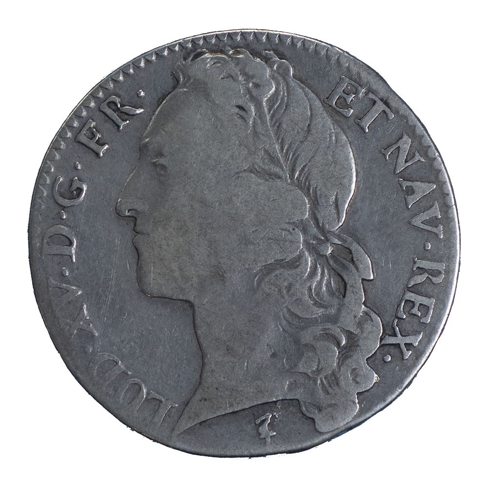 Légende : LUD. XV. D. G. FR. ET NAV. REX. (Louis XV, par la grâce de Dieu, roi de France et de Navarre).