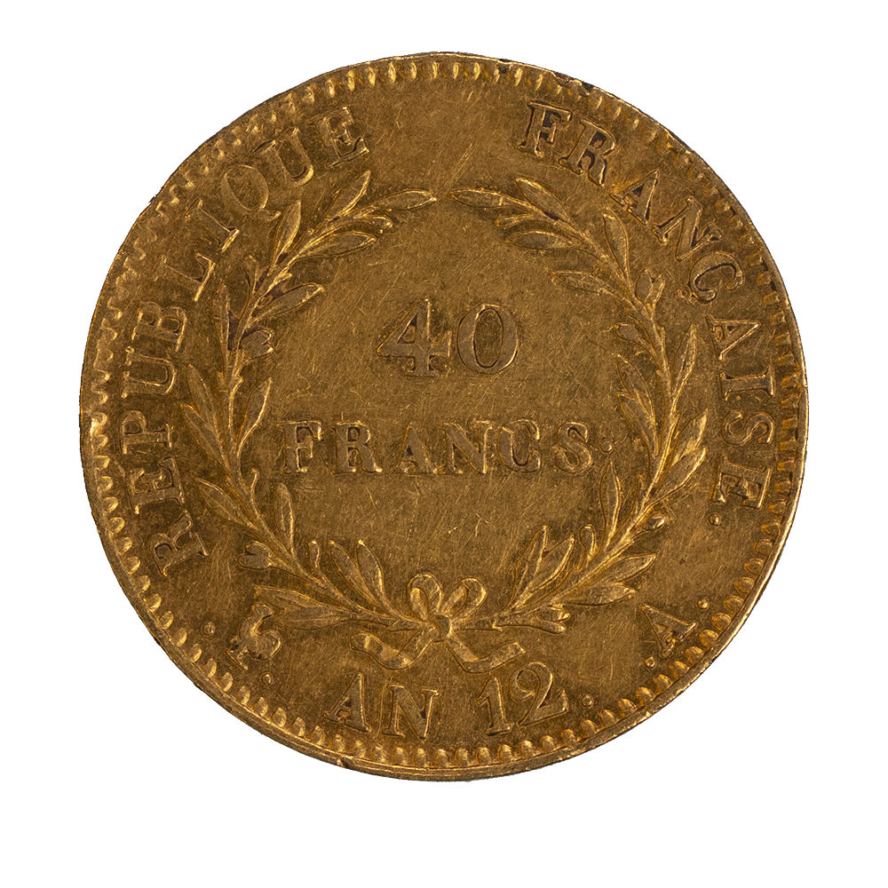 Description: 40 FRANCS sur deux lignes dans une couronne formé de deux branches d'olivier nouées à leur base.