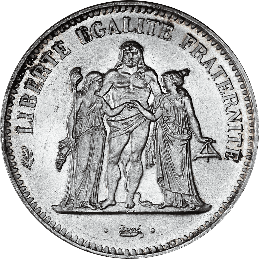 Description : Hercule barbu coiffé de la léonté (peau du lion de Némée) entrain d'unir la Liberté drapée à gauche arborant un bonnet phrygien et de l'Egalité à droite tenant un niveau; le tout est entouré de la légende commençant par une feuille d'olivier. Le nom du graveur sous Hercule.