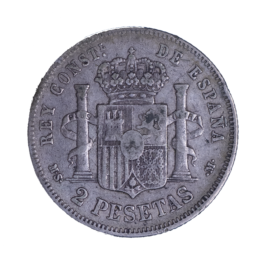 Légende : REY CONSTL. DE ESPAÑA / E.M. 2 PESETAS .M.