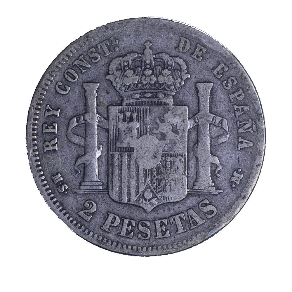 Légende : REY CONSTL. DE ESPAÑA / E.M. 2 PESETAS .M.