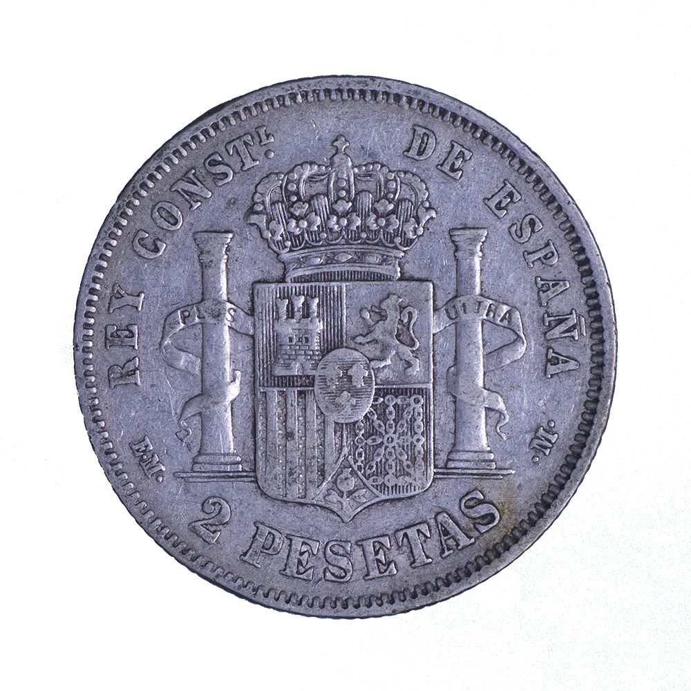 Légende : REY CONSTL. DE ESPAÑA / E.M. 2 PESETAS .M.