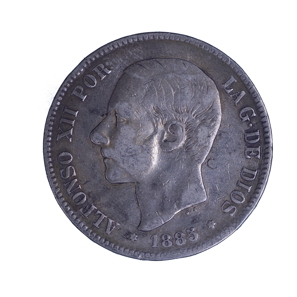 Légende : ALFONSO XII REY DE ESPANA 1885 (Alphonse XII Roi d'Espagne 1885)