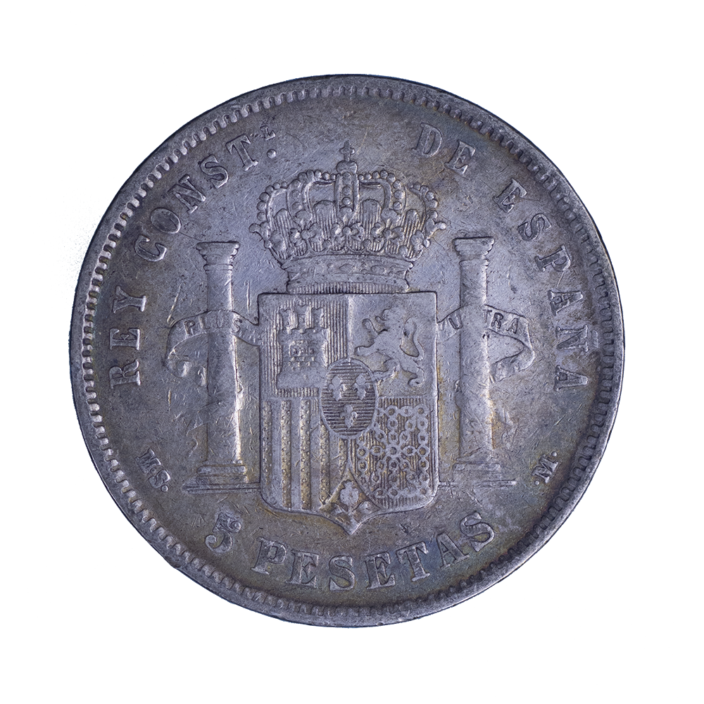 Légende : REY CONSTL. DE ESPAÑA / M.S. - 5 PESETAS - .M..