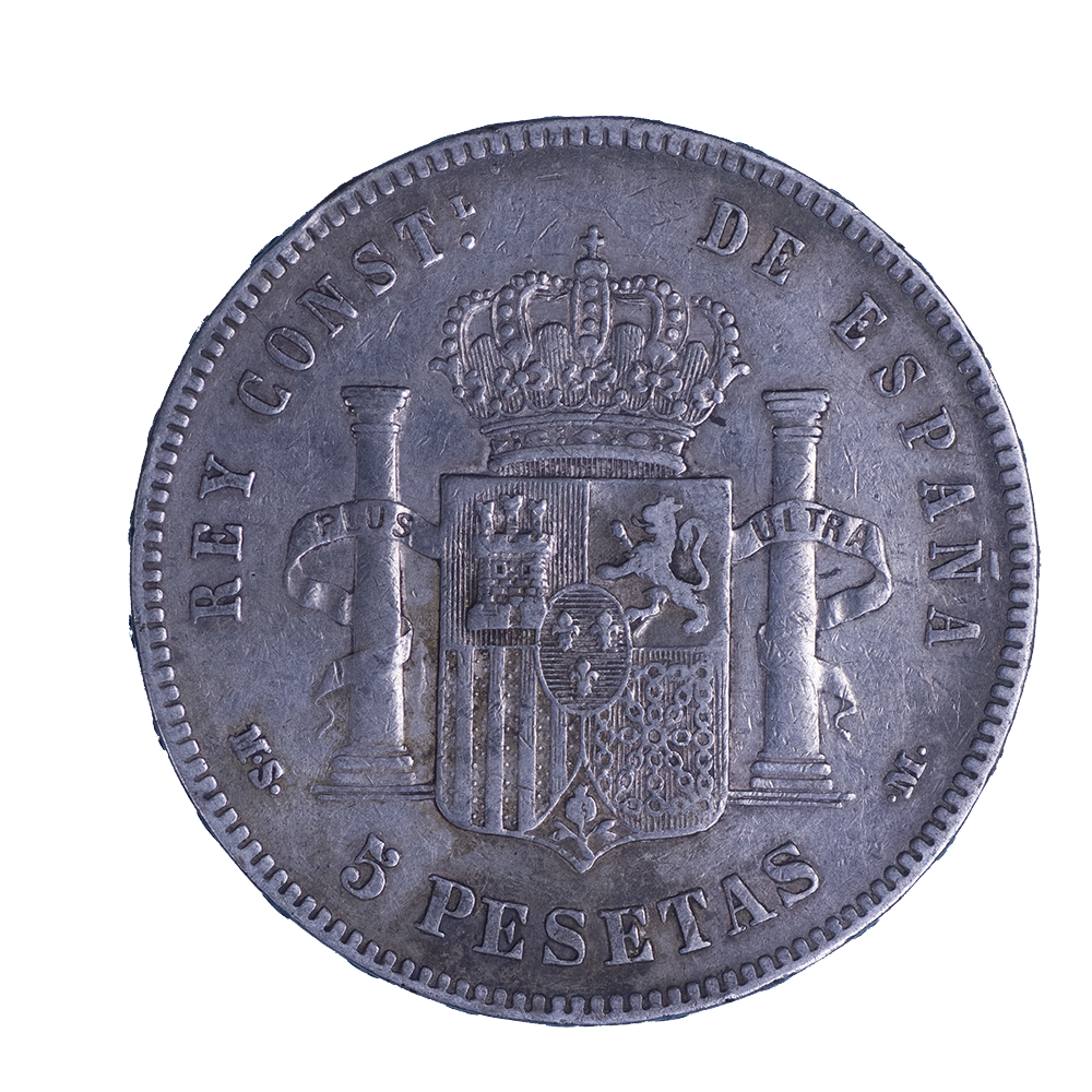 Légende : REY CONSTL. DE ESPAÑA / M.S. - 5 PESETAS - .M..
