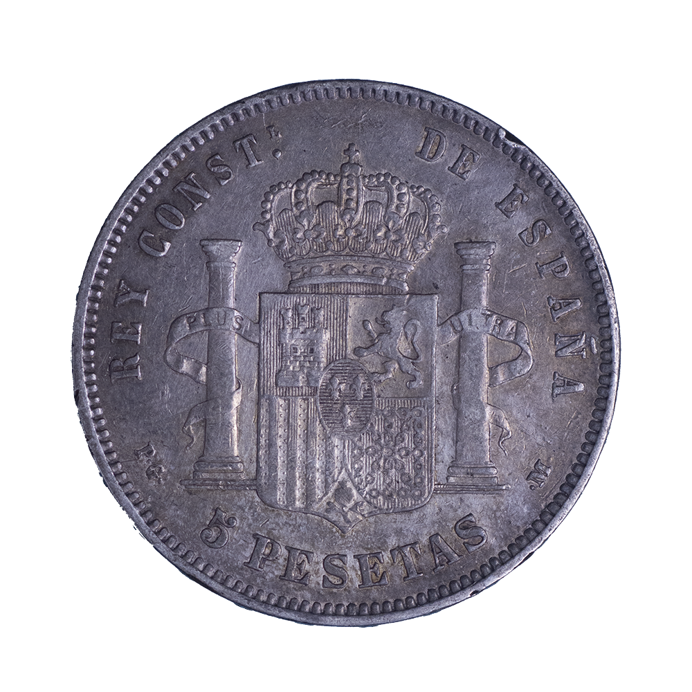 Légende : REY CONSTL. DE ESPAÑA /P.G. 5 PESETAS .M..