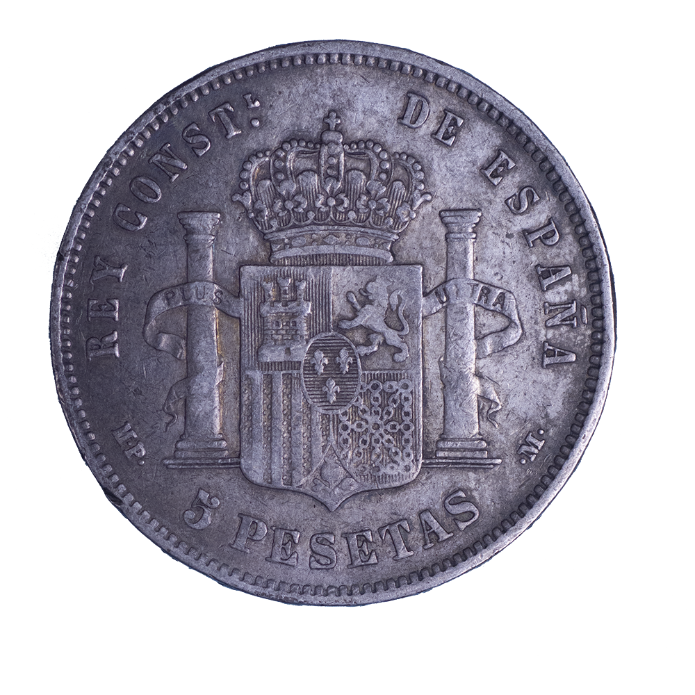 Légende : REY CONSTL. DE ESPAÑA /P.G. 5 PESETAS .M..