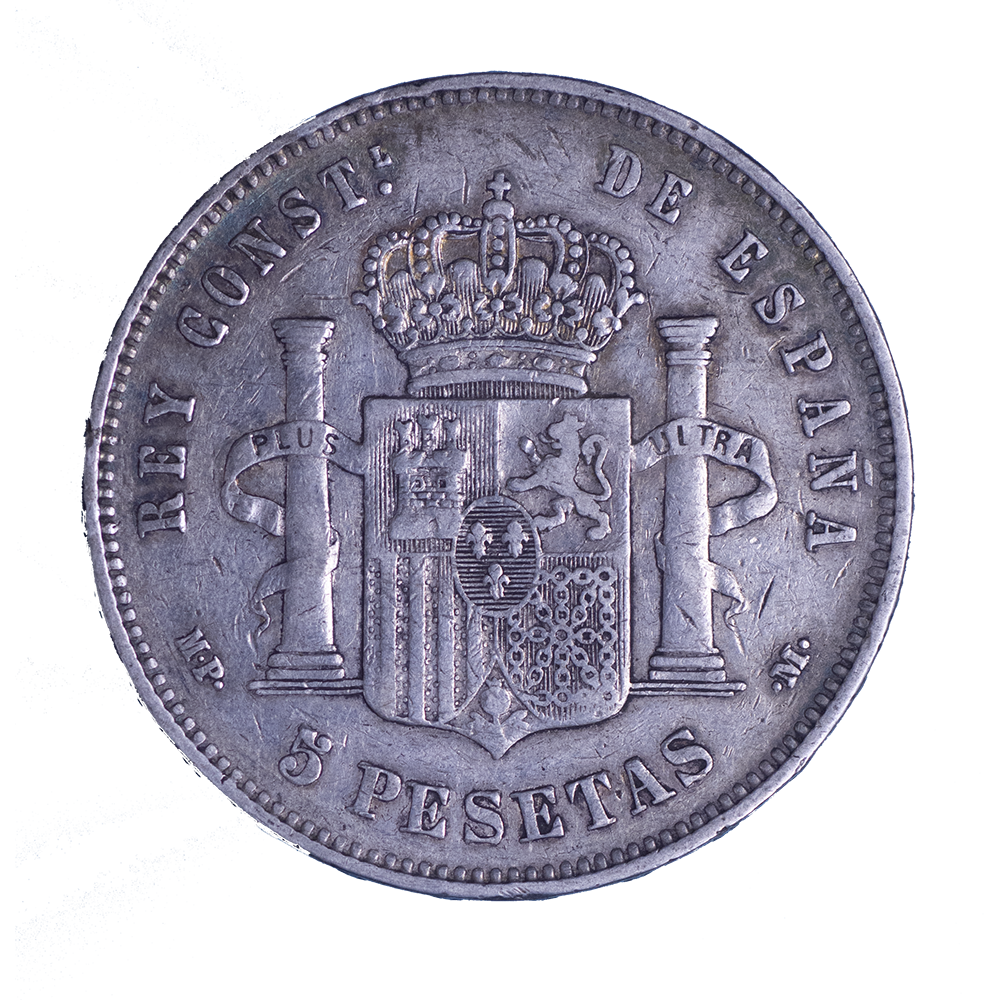 Légende : REY CONSTL. DE ESPAÑA /P.G. 5 PESETAS .M..