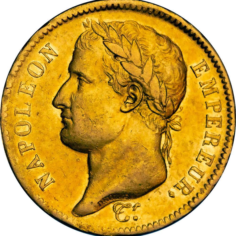Description : profil gauche de Napoléon 1er tête laurée, les rubans descendant derrière la nuque ; signé DROZ F* sur la tranche du cou ; au-dessous Tr* cursif.