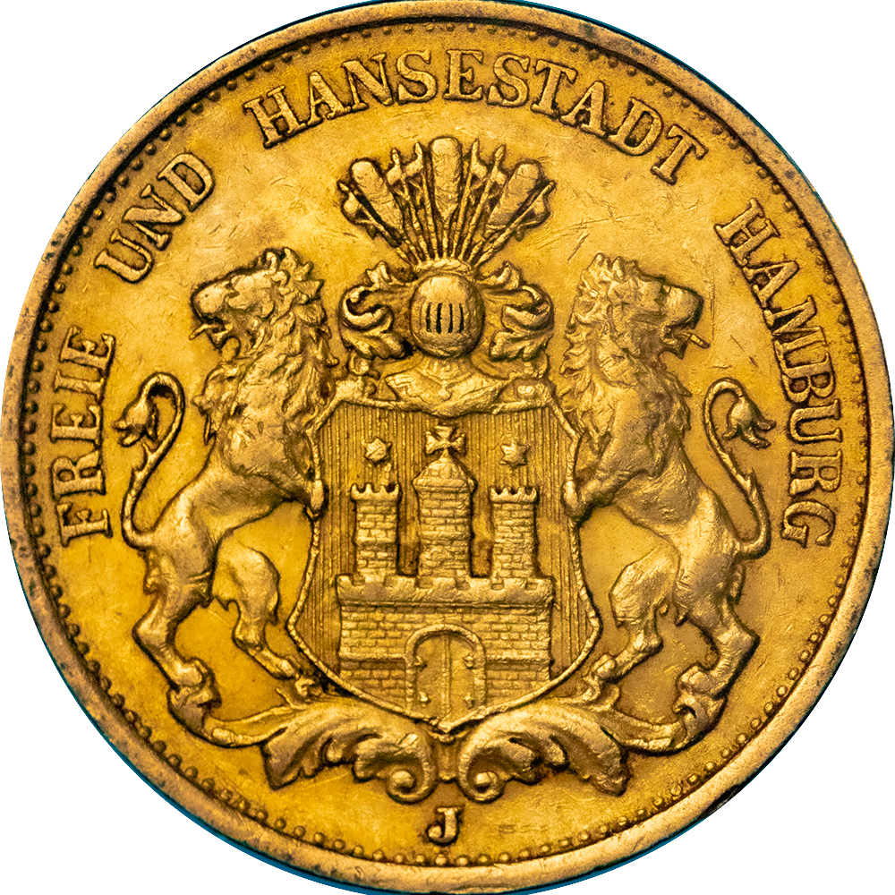 Cette pièce de 20 Mark Or de la ville hanséatique de Hamourg a été frappée à plus de 7,5 millions d'exemplaires entre 1875 et 1913. Cette pièce en Or allemande pèse 7,96 grammes pour un titrage de 900‰, comme toutes les pièces d'or de 20 mark de l'Empire allemand. Elle est témoin de la structure politique assez particulière de l’Empire, avec des “États libres”. En effet Hambourg, cité hanséatique, réussit jusqu’en 1918 à conserver son statut de ville libre et son indépendance. Une pièce historique, idéale pour votre collection.