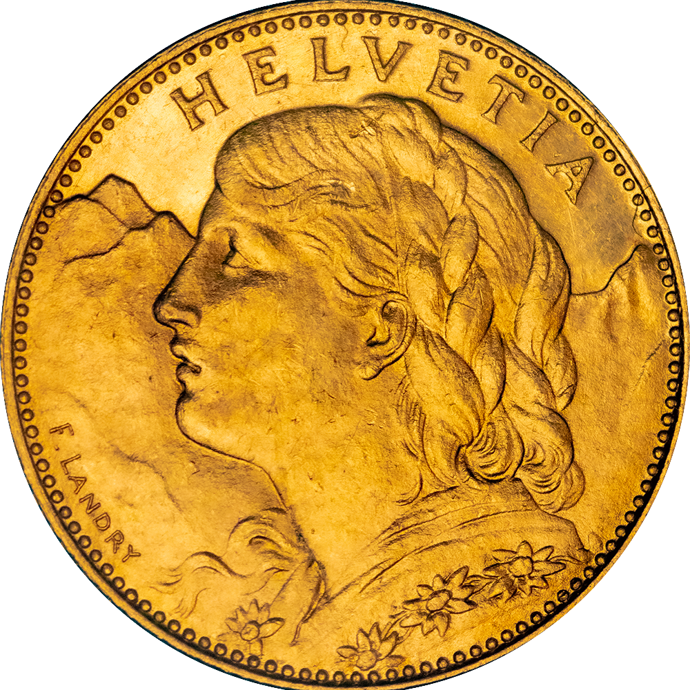 AVERS : Description : Buste diadémé d'Helvetia à gauche devant un paysage montagneux ; signature F. LANDRY devant le visage.