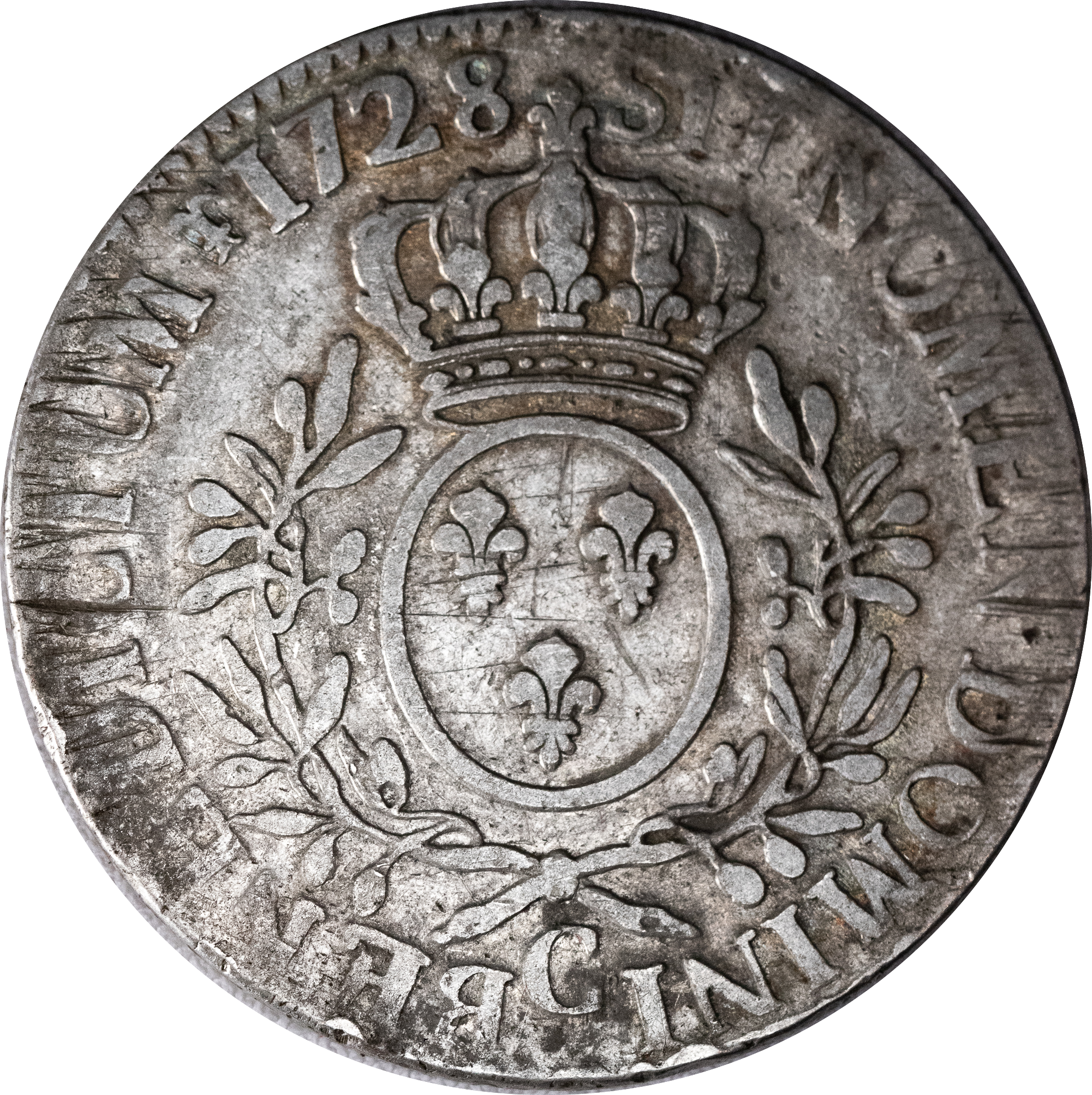 PRIX ET VALEUR DU ROYAUME DE FRANCE - ÉCU LOUIS XV AUX BRANCHES D'OLIVIER 1728 C