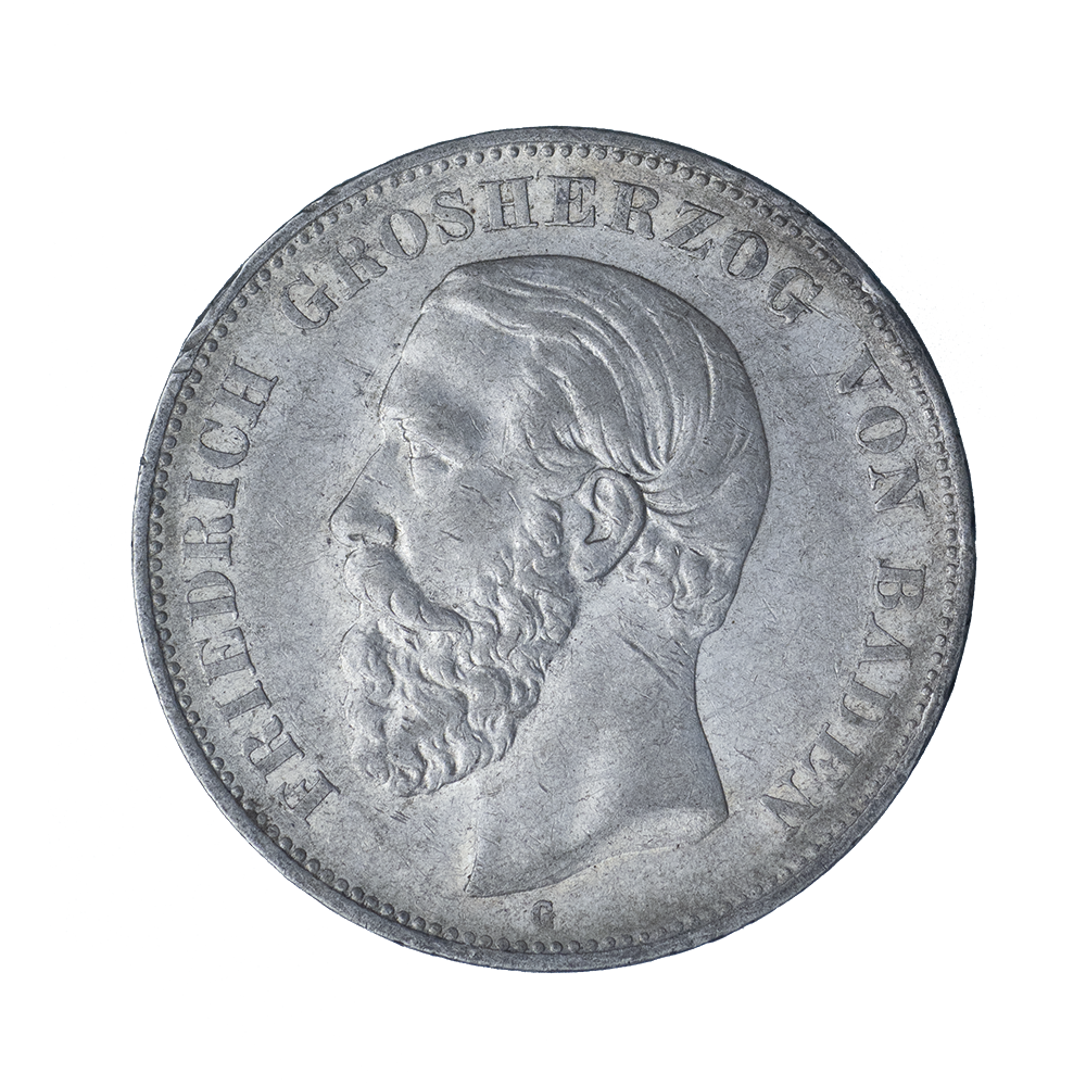 PRIX ET VALEUR DU PIÈCE DE MONNAIE : ALLEMAGNE-GRAND DUCHÉ DE BADE FRÉDÉRIC IER 5 MARK 1876 KARLSRUHE TYPE B^DEN (AVEC A SANS BARRE)