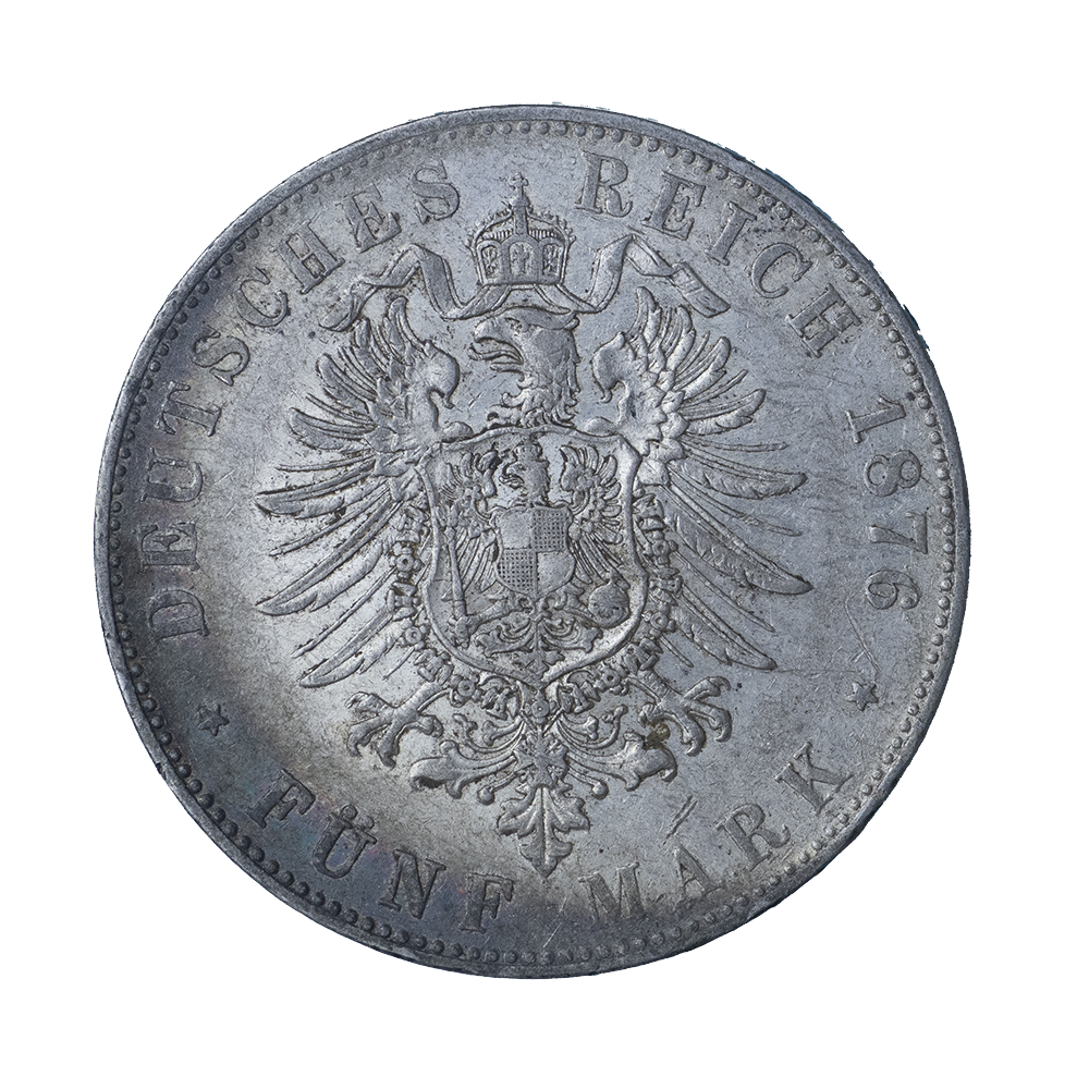 Pièce de monnaie : Allemagne-Grand Duché de Bade Frédéric Ier 5 Mark 1876 Karlsruhe type B^DEN (avec A sans barre)