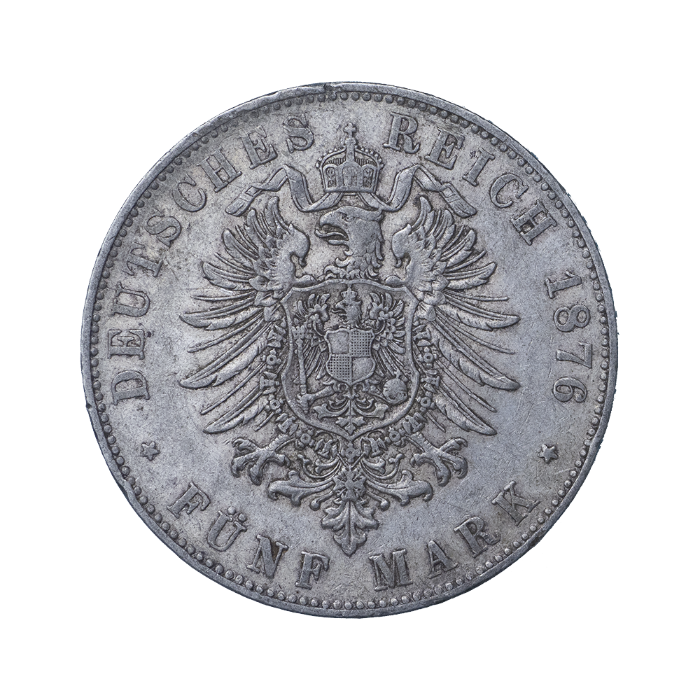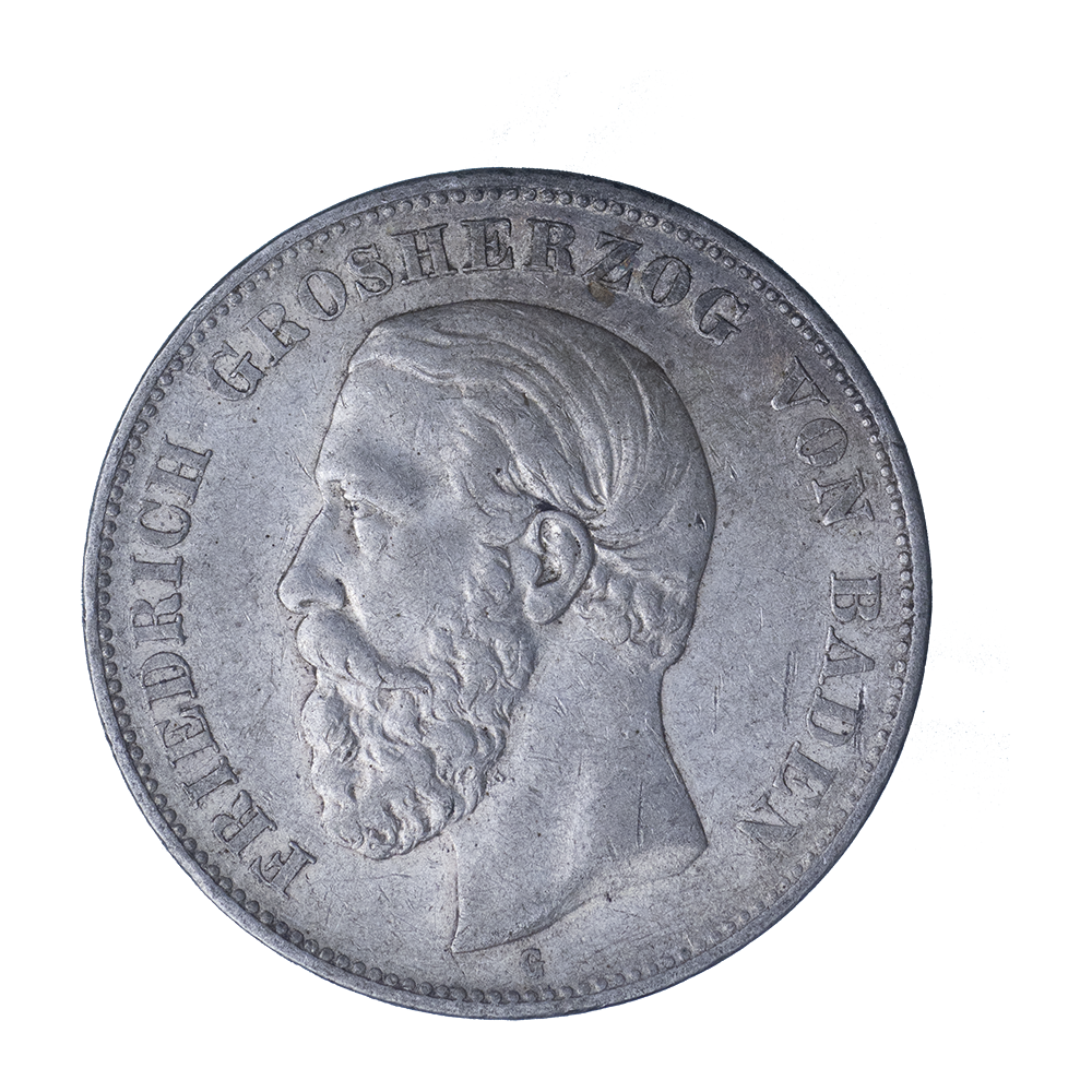 PRIX ET VALEUR DU PIÈCE DE MONNAIE : ALLEMAGNE-GRAND DUCHÉ DE BADE FRÉDÉRIC IER 5 MARK 1876 KARLSRUHE TYPE B^DEN (AVEC A SANS BARRE)