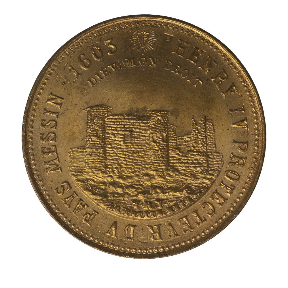 Légende : HENRY IV PROTECTEVR DV PAYS MESSIN 1603 . DIEV MON DROIT / VRY LA PETITE METZ.