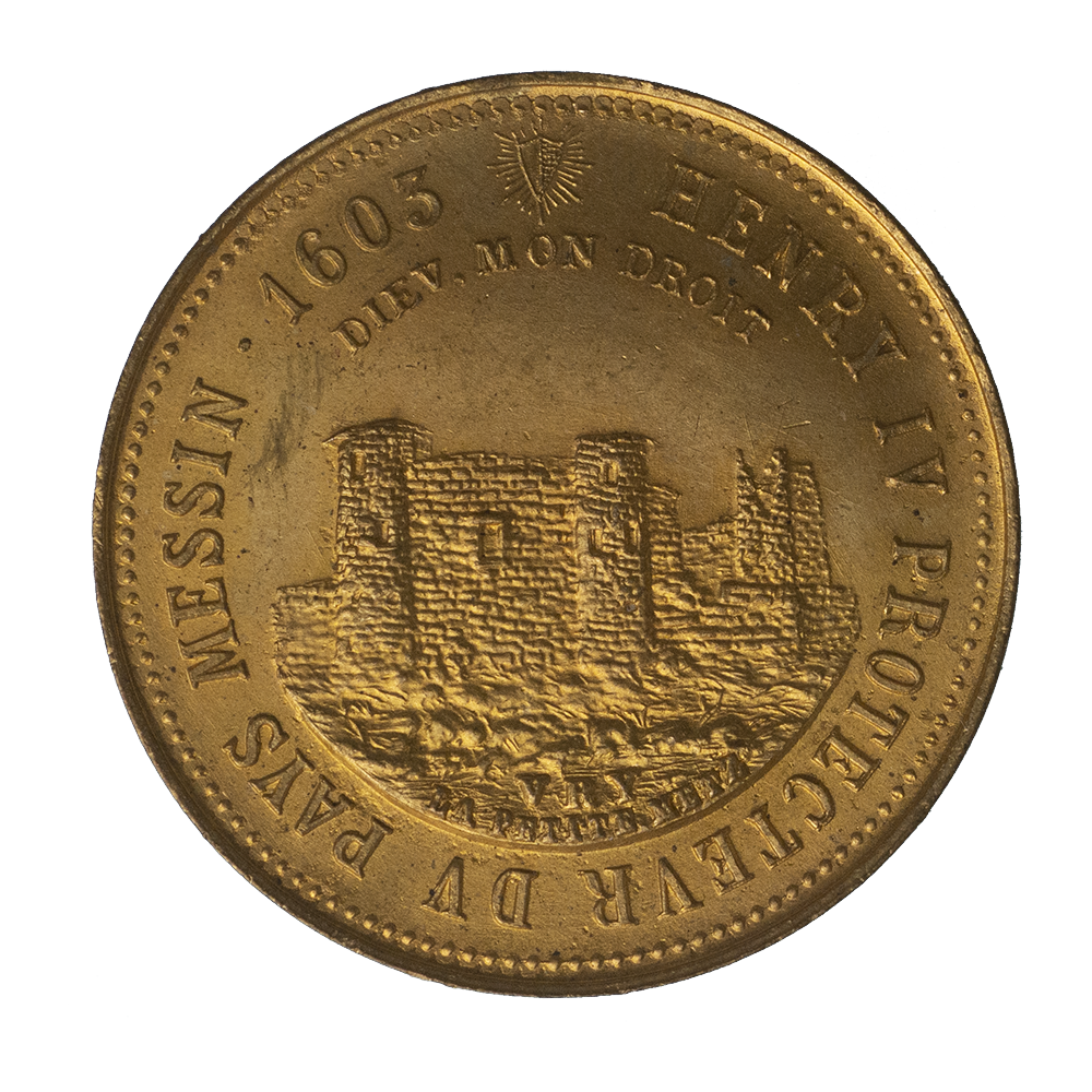 Légende : HENRY IV PROTECTEVR DV PAYS MESSIN 1603 . DIEV MON DROIT / VRY LA PETITE METZ.