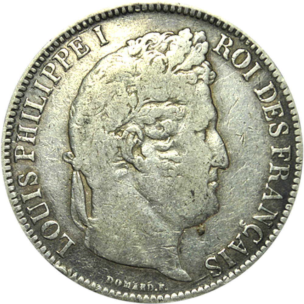 Description : Profil droit de Louis-Philippe 1er coiffé d'une couronne de chêne dont l'une des extrémités du ruban qui la noue derrière la tête revient sur le bas du cou ; signé DOMARD* F* au-dessous du cou contre le listel.