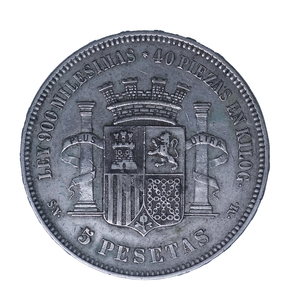 Légende : LEY 900 MILLESIMAS * 40 PIEZAS EN KILOG. // S.N. 5 PESETAS .M.. (LOI 900 MILLESIME * 40 PIÈCES EN KILOG. // S.N. 5 PESETAS .M..