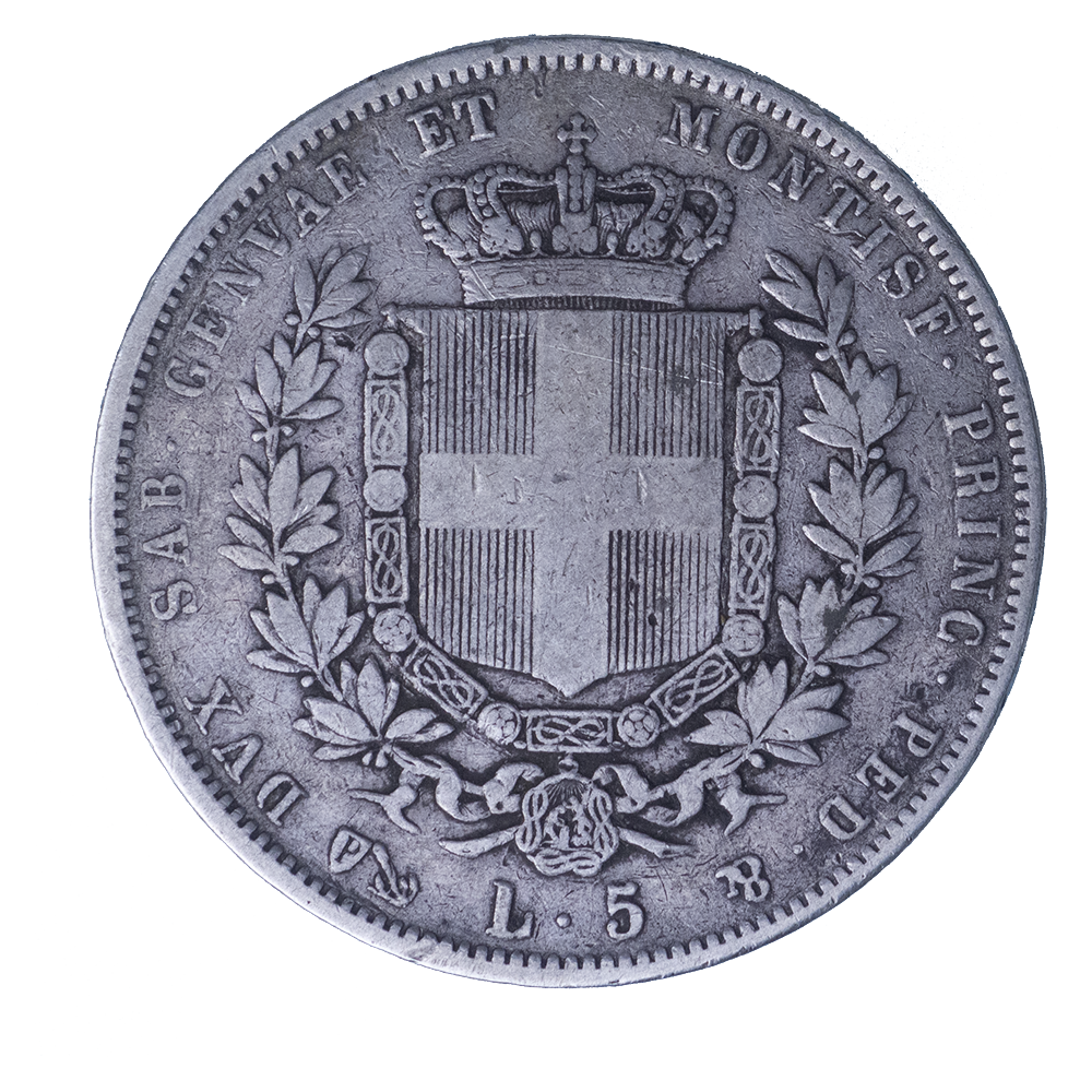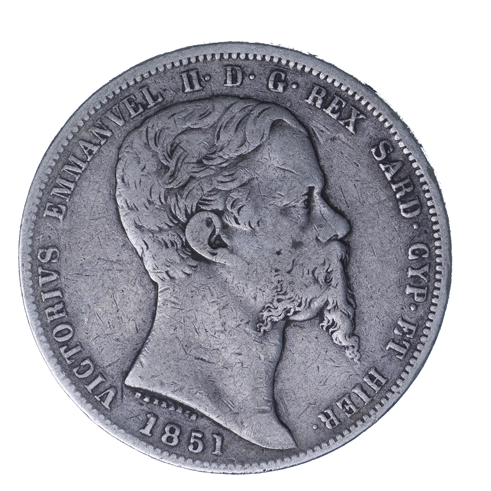 Légende : VICTORIVS. EMMANVEL. II. D. G. REX. SARD. CYP. ET HIER./ 1851. (Victor-Emmanuel II par la grâce de Dieu, roi de Sardaigne, de Chypre et de Jérusalem).