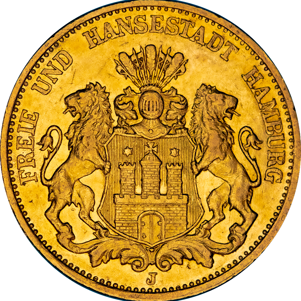 Cette pièce de 20 Mark Or de la ville hanséatique de Hamourg a été frappée à plus de 7,5 millions d'exemplaires entre 1875 et 1913. Cette pièce en Or allemande pèse 7,96 grammes pour un titrage de 900‰, comme toutes les pièces d'or de 20 mark de l'Empire allemand. Elle est témoin de la structure politique assez particulière de l’Empire, avec des “États libres”. En effet Hambourg, cité hanséatique, réussit jusqu’en 1918 à conserver son statut de ville libre et son indépendance. Une pièce historique, idéale pour votre collection.