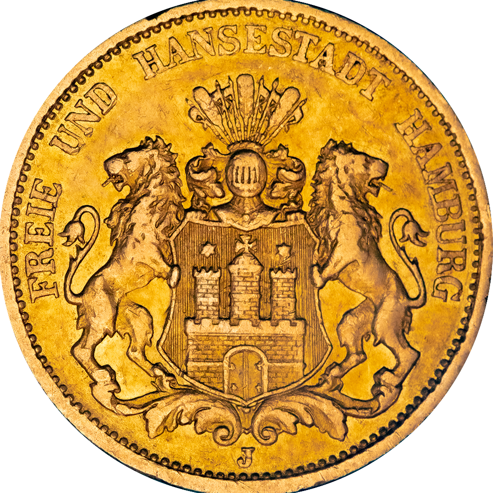 Cette pièce de 20 Mark Or de la ville hanséatique de Hamourg a été frappée à plus de 7,5 millions d'exemplaires entre 1875 et 1913. Cette pièce en Or allemande pèse 7,96 grammes pour un titrage de 900‰, comme toutes les pièces d'or de 20 mark de l'Empire allemand. Elle est témoin de la structure politique assez particulière de l’Empire, avec des “États libres”. En effet Hambourg, cité hanséatique, réussit jusqu’en 1918 à conserver son statut de ville libre et son indépendance. Une pièce historique, idéale pour votre collection.