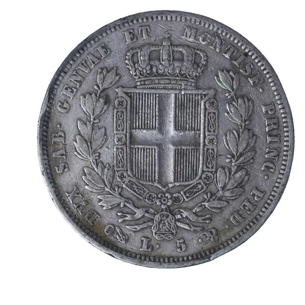 Légende : DVX. SAB. GENVAE ET. MONTISF. PRINC. PED. &./ L. - 5 (Duc de Savoie, Gênes et Montferrat, prince du Piémont etc)