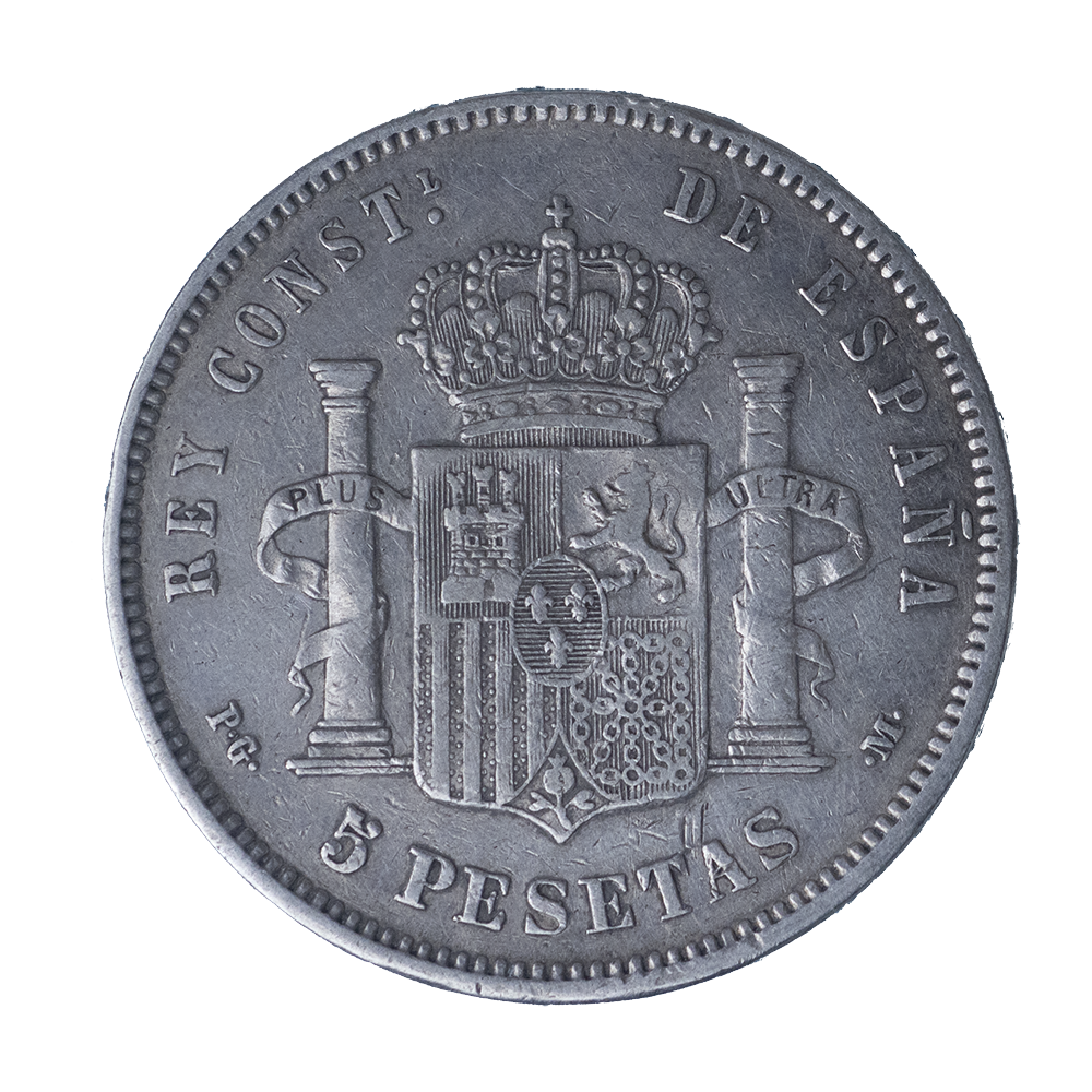 Légende : REY CONSTL. DE ESPAÑA /S.G.V. 5 PESETAS .M..