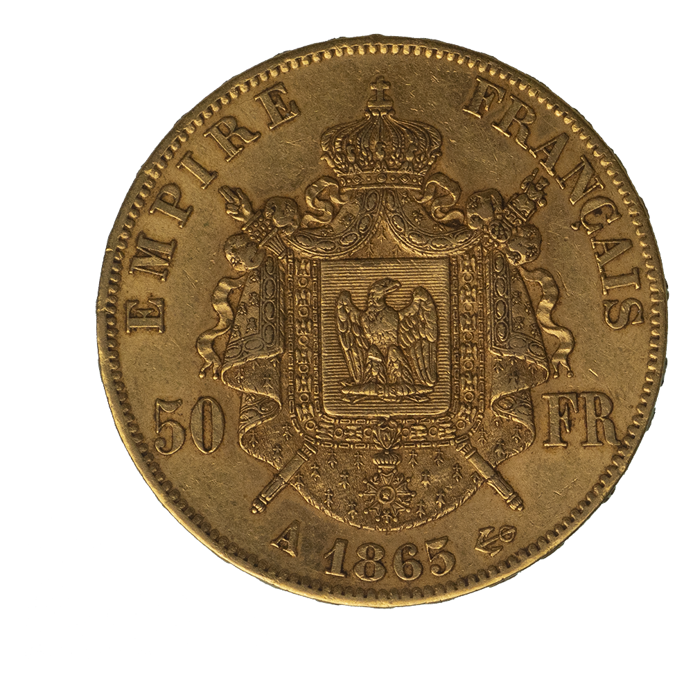 Le tout sommée d'une couronne impériale de laquelle partent deux rubans ; au-dessous, le millésime 1865 la lettre d'atelier A à gauche.