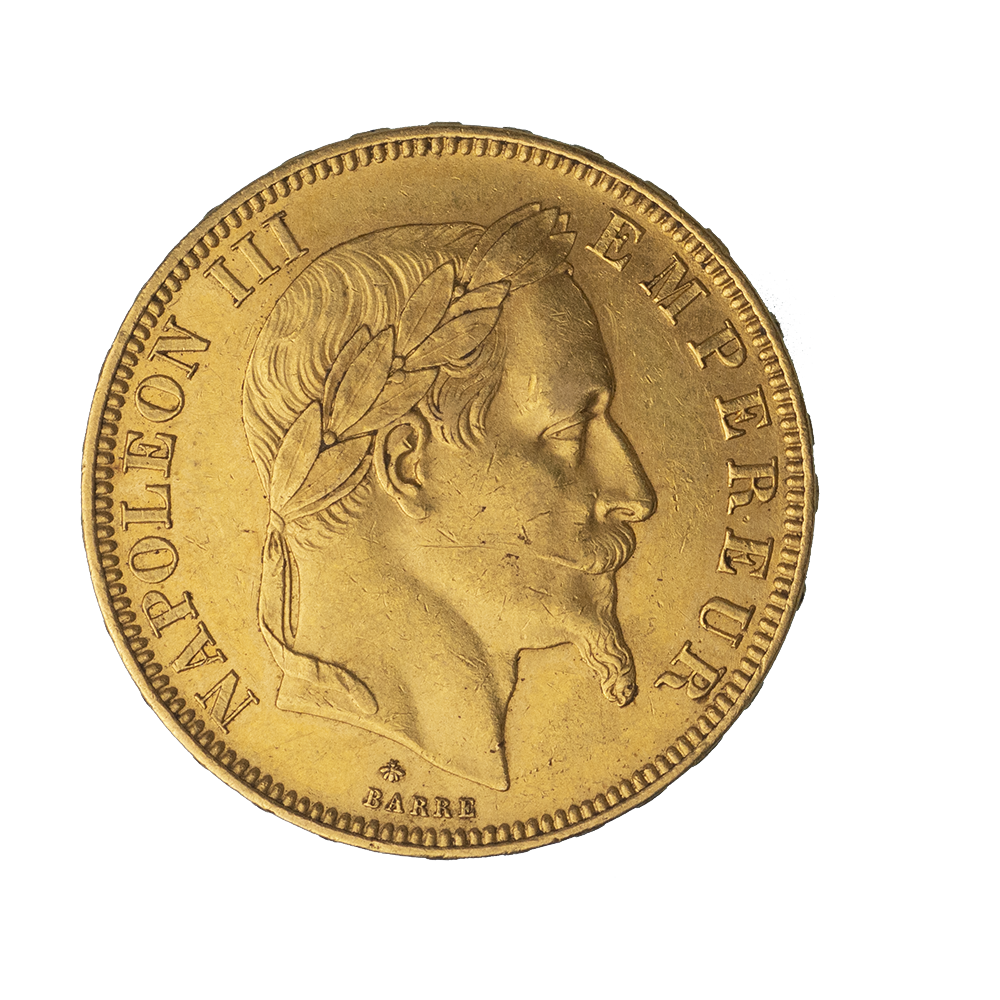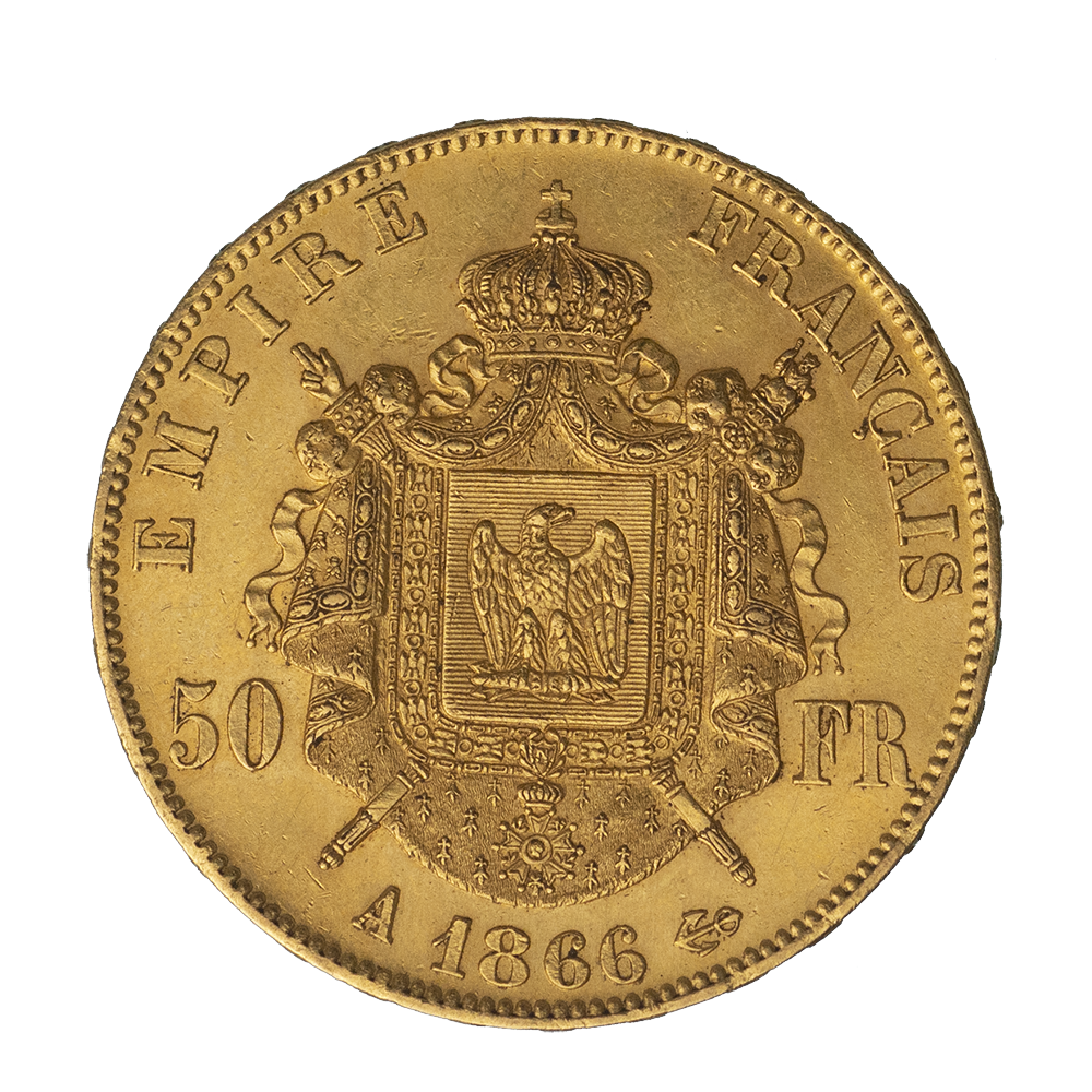 Le tout sommée d'une couronne impériale de laquelle partent deux rubans ; au-dessous, le millésime 1866 la lettre d'atelier A à gauche.