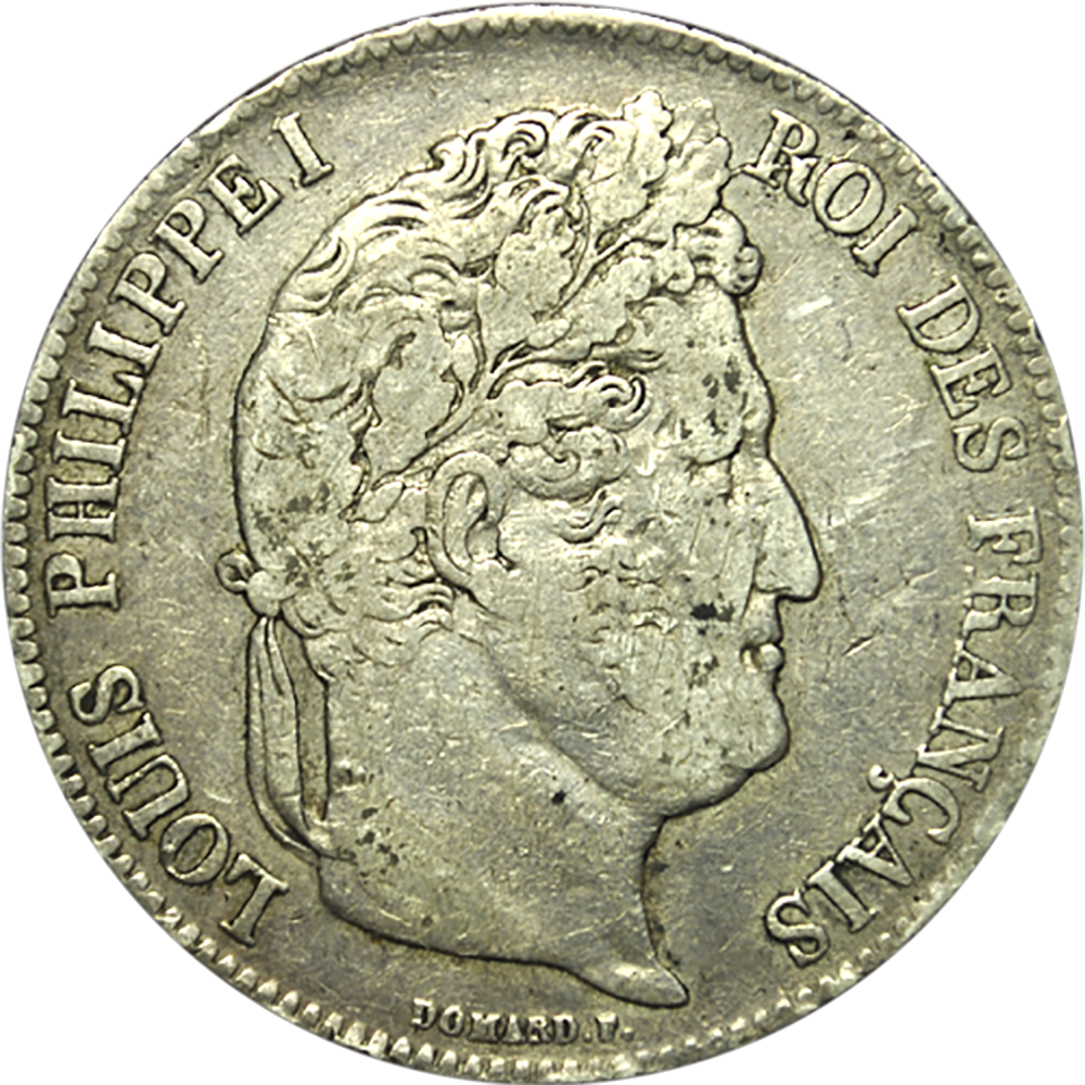 Description : Profil droit de Louis-Philippe 1er coiffé d'une couronne de chêne dont l'une des extrémités du ruban qui la noue derrière la tête revient sur le bas du cou ; signé DOMARD* F* au-dessous du cou contre le listel.